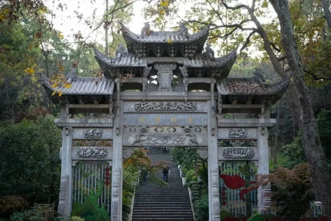 继续向东南方向进发,便是著名的万松书院。万松书院由唐代报恩寺改辟,明代弘治年间建成,是明清两代文人汇集讲学之地。康乾两帝南巡杭州时分赐"浙水敷文"、"湖山萃秀"两块匾额,足见书院在历史上的地位。梁祝的佳话,更是给书院添加了一份浪漫凄美的色彩,时至今日仍为大家津津乐道。往事已经逝去,历史的典故仅仅是点缀,大家今日的行程多半是冲着秋日美景而来。书院周围鸟语树香,灌木丛中小动物们机灵鬼祟、若隐若现,好一派机智和谐的生态景观。大家沉浸在这自然之美中,流连忘返。