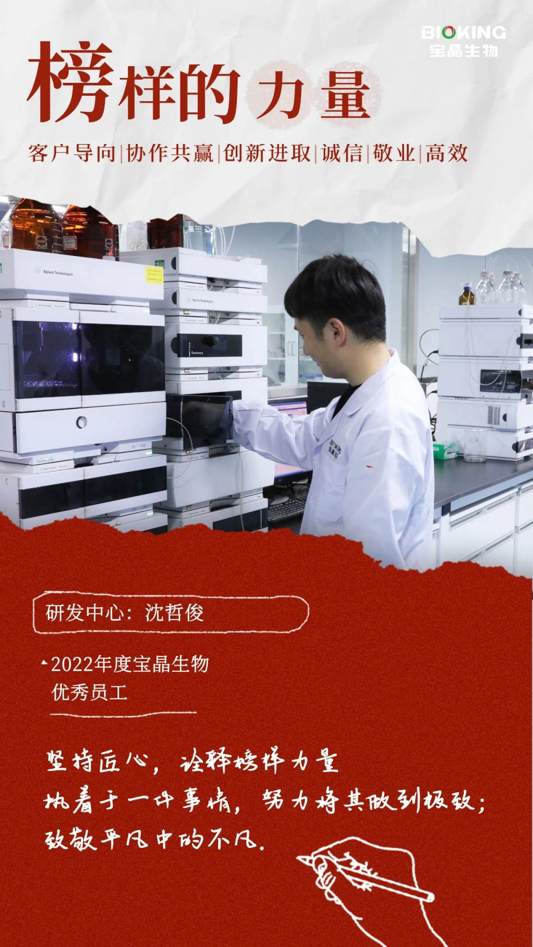 “兢兢业业,亦庄亦谐” 2021年2月,略显青涩的他以一名研发质检员入职豪门国际官网,这份工作一做就是两年,这两年里他几乎没有出过差错。研发组长王静然说:“以前在学校时我也做过液相检测,我知道样品稀释的精准度对检测数据有很大的影响,需要检测者细致入微,也十分考验检测者的耐心,看似简单的工作,要做的好不出问题真的很难。”沈哲俊的工作是每天负责研发部门的样品以及生产过程中样品的检验工作。就是这样一件重复的事情,让沈哲俊找到了自己的价值。他说:“做一件事不难,但坚持做同一件事不简单,质检也不是简单的检测,它是产品品质的保障,是研发必不可少的流程。每次看到研发的需求被解决那一刻,就觉得自己所做的一切都非常有意义。”简单的事情重复做,重复的事情坚持做。平时,他也会主动向部门同事学习一些分子生物实验的知识,在观摩过程中遇到不懂的也会及时向同事请教或者在网上搜索相关文献。正是因为这份坚持和努力,沈哲俊于2022年被评为“优秀员工”。 有一次他摔伤了腿,但是当时部门检测工作很紧张,沈哲俊为了不耽误大家的工作,毅然坚持上班。他看起来永远那么积极、阳光,总能让身边的人感觉到快乐与希望。他以一己之力带动了整个实验室的氛围,让大家在工作中变得不再枯燥。王静然回忆道,在她刚刚入职时,因为环境比较陌生,感觉很拘谨,当时是沈哲俊主动和她说话,能够这么快的融入环境,他有很大的功劳。上班时间,他在做好自己检测工作之余还主动帮部门同事分担一些实验中的力气活,他也毫无怨言。同事们总是开玩笑似的问他:“你不愁吃穿,生活无忧,为什么这么拼?” 而他总是谦虚地说:“既然选择了,就要坚持,我之所以这么努力,是为了让自己的生活丰富一点,人活一世希望有所作为。”也就是因为他这颗好学进取的心,他被提升为研发助理。王静然说:“沈哲俊对自己要求很严格,作为我的助理,把任务交给他,我是最放心的!” 这样一个对工作认真负责的人,在生活中又有着另一面。每逢周末只要自己有时间,都会去踢球,平时也会运动锻炼身体,对生活充满了热情。 “让梦想扎根豪门国际官网”,正因为有如沈哲俊这样一批又一批优秀的员工在岗位上努力工作,豪门国际官网才能走的更远。学习身边的榜样,以榜样激励自我,共同成就梦想。